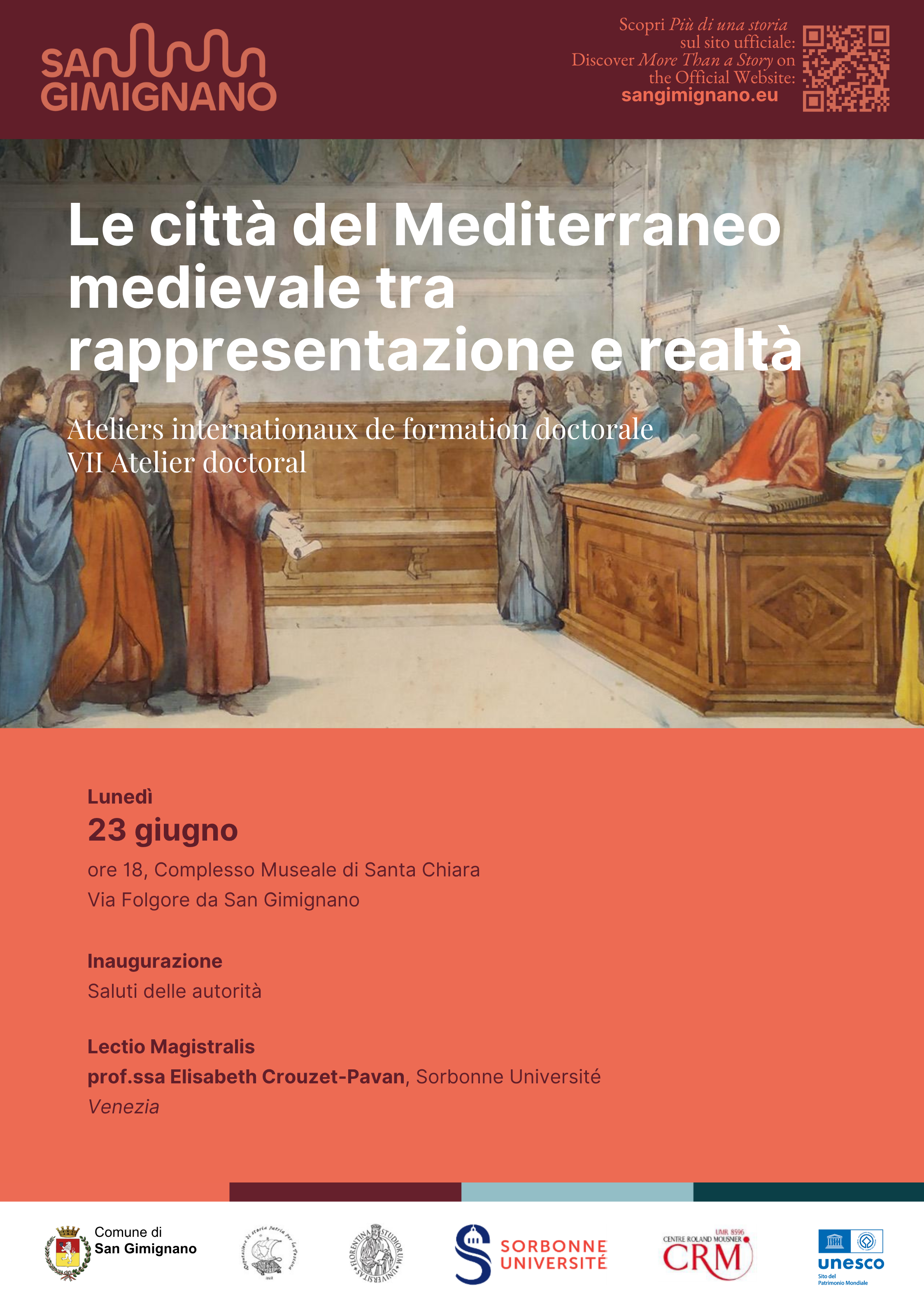 L’Atelier doctoral “Le città del Mediterraneo medievale tra rappresentazione e realtà” torna a San Gimignano con un ricco programma e due incontri pubblici. Il primo è fissato per lunedì 23 giugno alle ore 18 nel Complesso Museale di Santa Chiara con la Lectio Magistralis su “Venezia” tenuta dalla professoressa Elisabeth Crouzet-Pavan della Sorbonne Université.