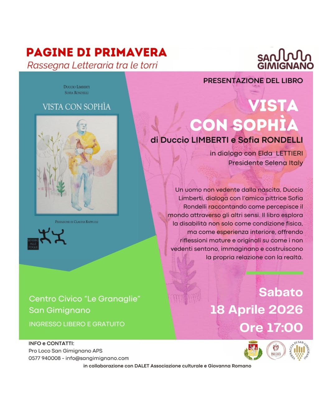 Sabato 18 aprile, alle ore 17, il Centro Civico comunale "Le granaglie" accoglierà la presentazione del libro “Vista con Sophia”, scritto da Duccio Limberti e Sofia Rondelli che saranno presenti insieme a Elda Lettieri, presidente di Selena Italy.
