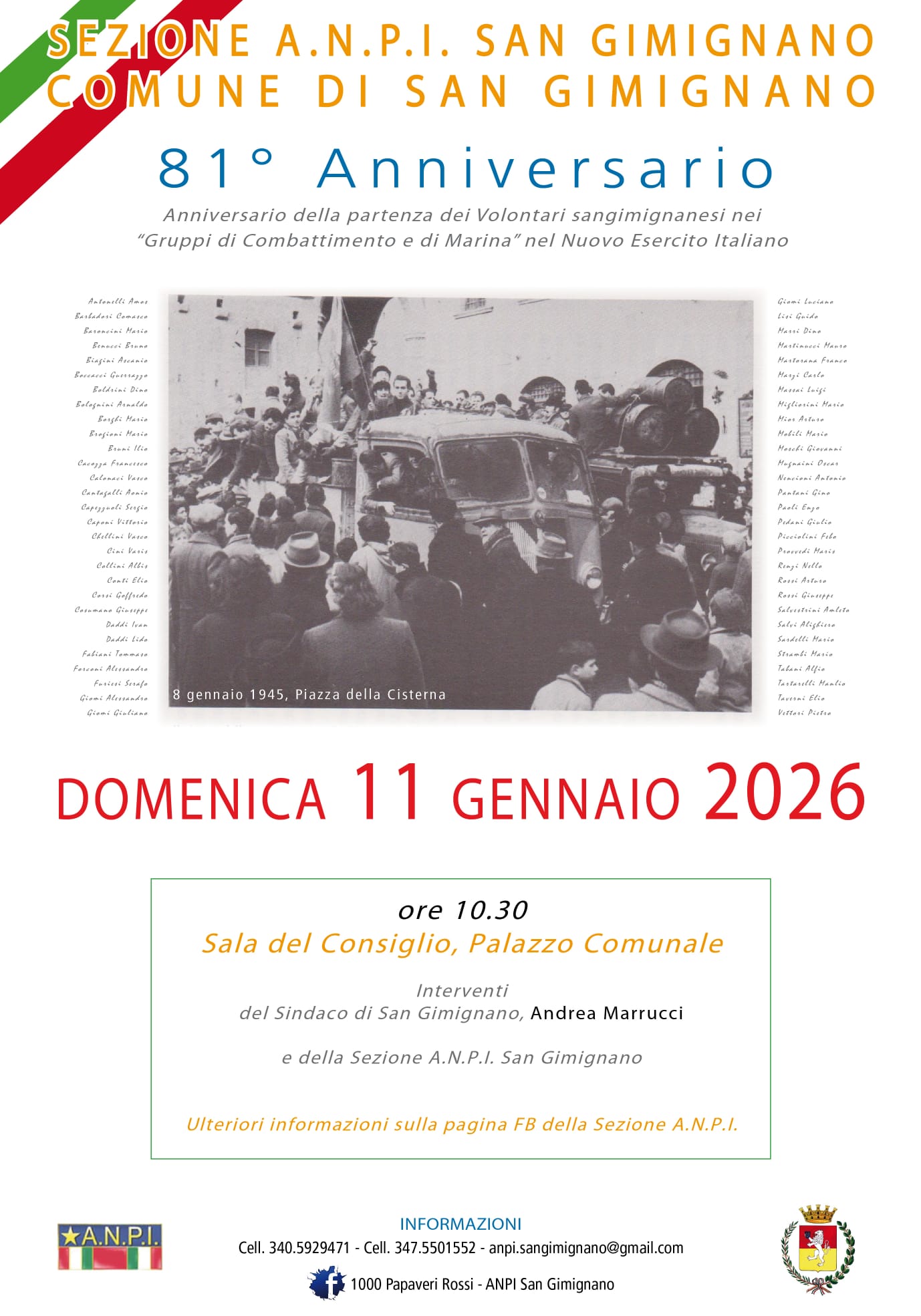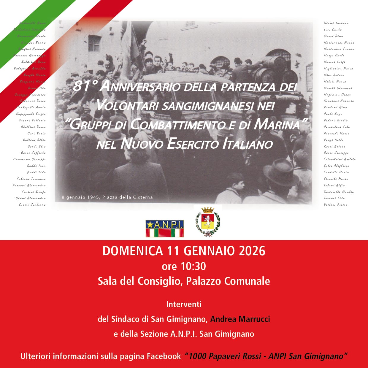 Domenica 11 gennaio San Gimignano ricorderà l’81° anniversario della partenza dei volontari sangimignanesi nei “Gruppi di Combattimento e di Marina” del nuovo esercito italiano, avvenuta l’8 gennaio 1945. La cerimonia è in programma alle ore 10.30 nella Sala del Consiglio e vedrà gli interventi del sindaco di San Gimignano, Andrea Marrucci, e dei rappresentanti della sezione ANPI di San Gimignano.