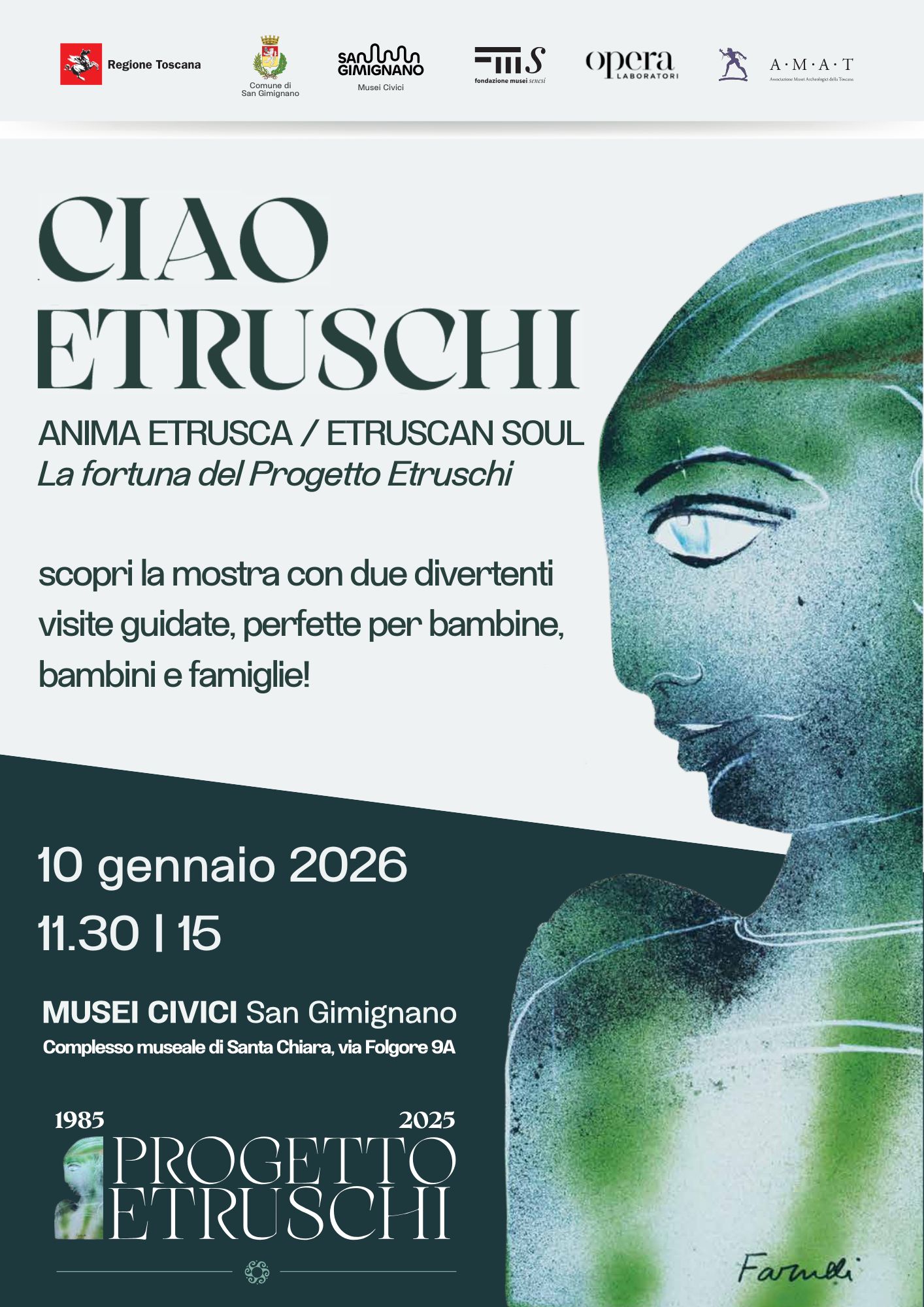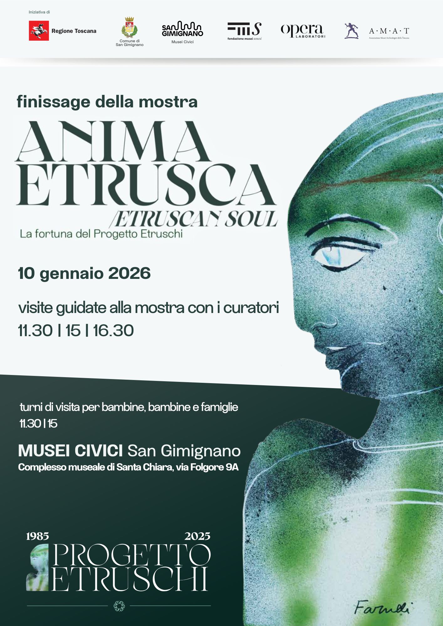 Si avvia alla conclusione Anima Etrusca / Etruscan Soul. La fortuna del Progetto Etruschi, la mostra allestita nel Complesso museale di Santa Chiara a San Gimignano nell’ambito di Progetto Etruschi 85/25 della Regione Toscana, promosso con Fondazione Musei Senesi e l’Associazione Musei Archeologici della Toscana. In occasione della fase finale dell’esposizione, prima della chiusura fissata per domenica 11 gennaio, il Complesso museale di Santa Chiara ospiterà alcune iniziative speciali pensate per accompagnare il pubblico al finissage. Sabato 10 gennaio sono in programma tre visite guidate gratuite con le curatrici e i curatori della mostra, alle ore 11.30, 15.00 e 16.30. Alle ore 11.30 e alle 15 si terrà inoltre Ciao Etruschi!, una visita speciale rivolta a bambine, bambini e famiglie, pensata per raccontare i contenuti della mostra attraverso un linguaggio accessibile e condiviso.