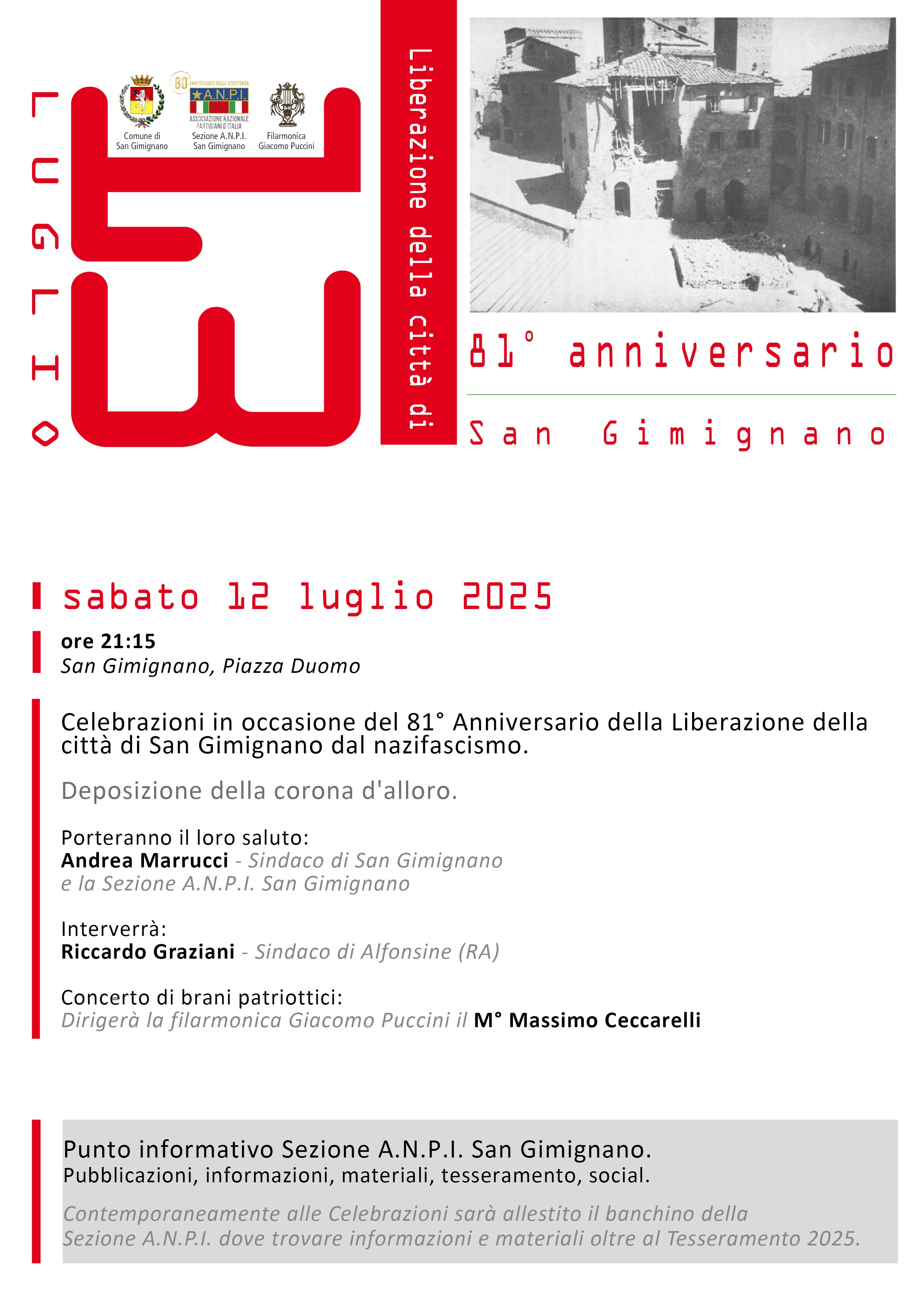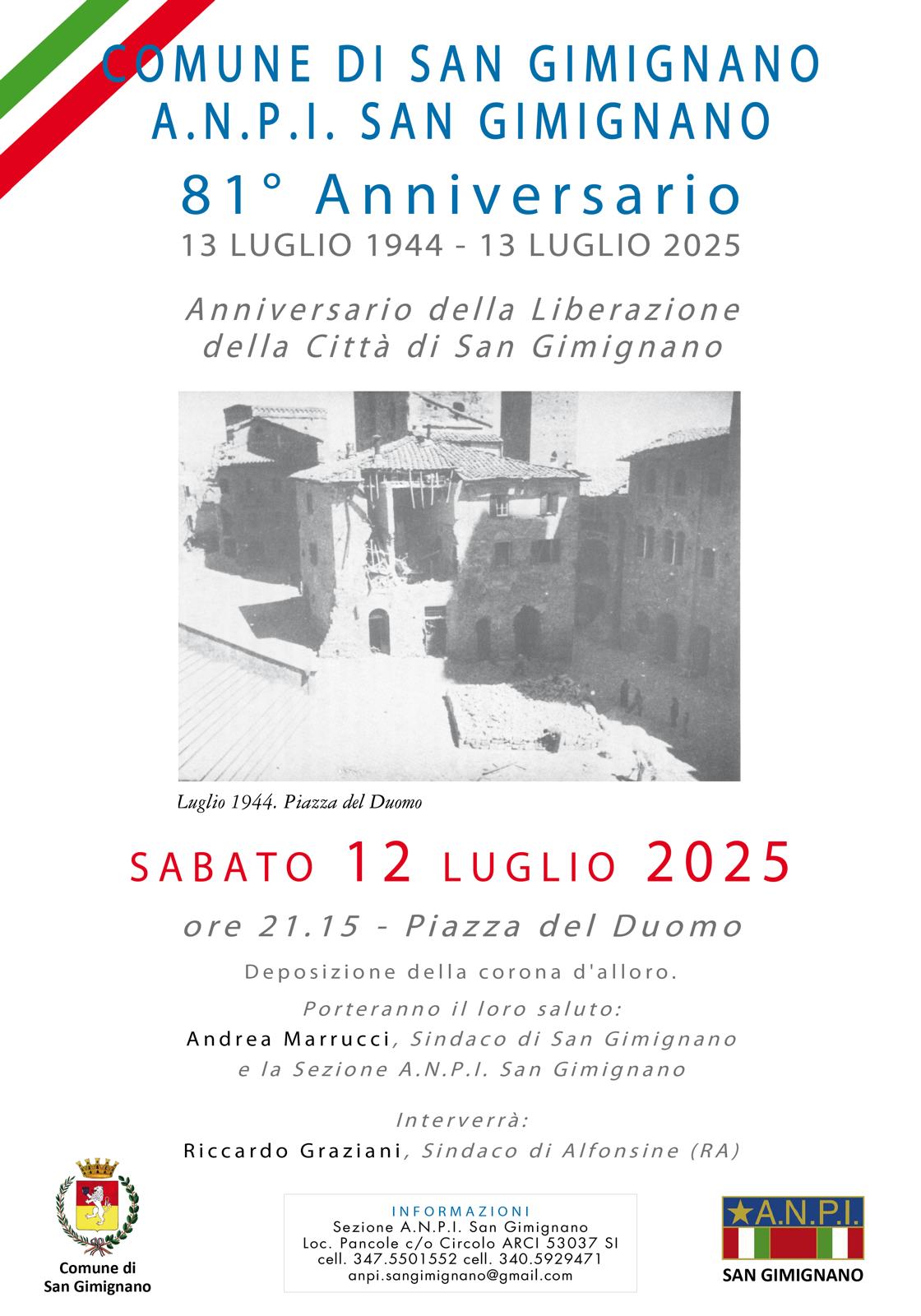 Sabato 12 luglio San Gimignano ricorderà l’81° anniversario della Liberazione della città dal nazifascismo, avvenuta il 13 luglio 1944.