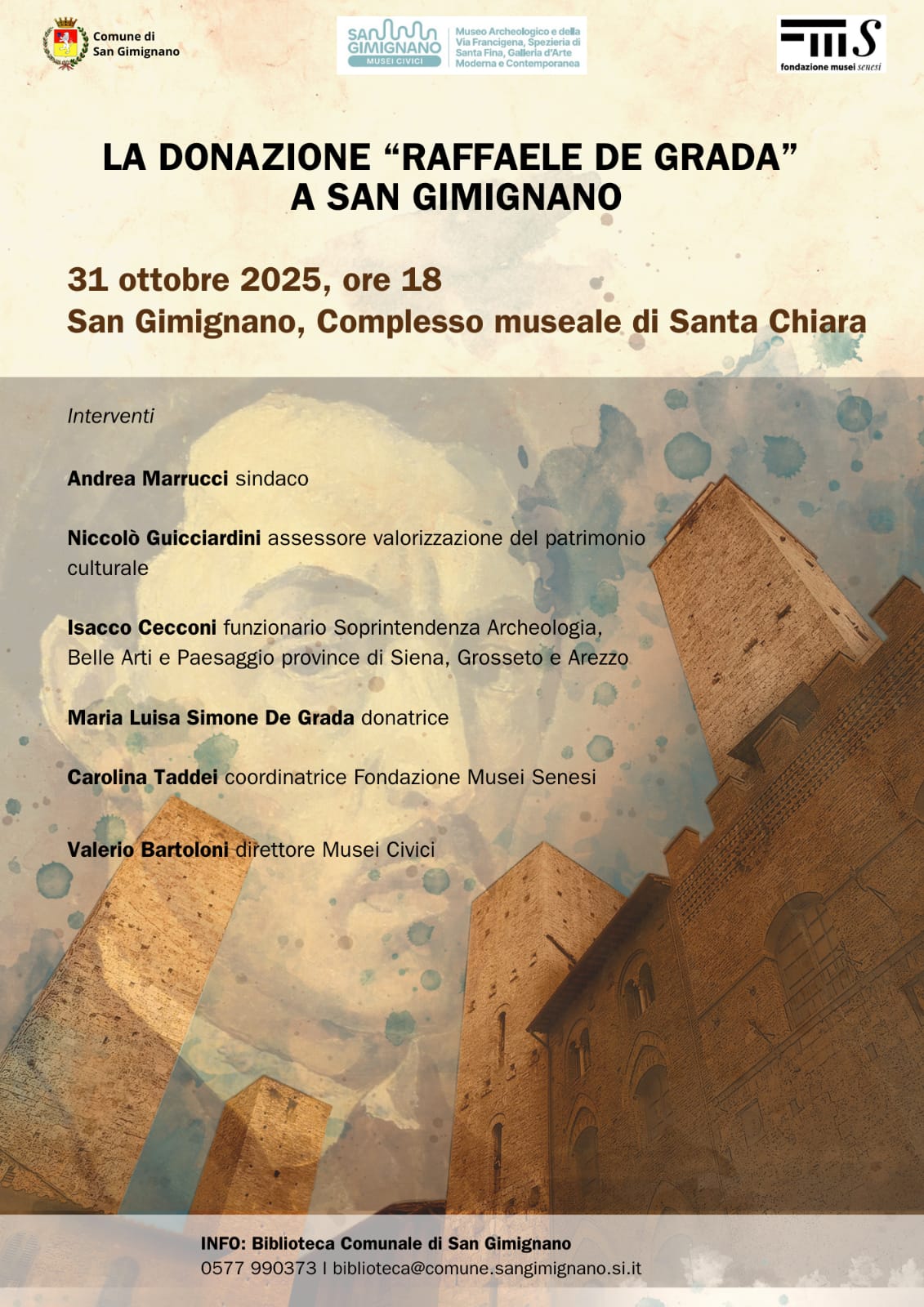 L’appuntamento si aprirà con gli interventi di Andrea Marrucci e Niccolò Guicciardini, rispettivamente sindaco e vicesindaco con delega alla valorizzazione del patrimonio culturale, e continuerà con Isacco Cecconi, funzionario della Soprintendenza Archeologia, Belle Arti e Paesaggio per le province di Siena, Arezzo e Grosseto. Seguiranno gli interventi della donatrice Maria Luisa Simone De Grada, di Carolina Taddei, coordinatrice della Fondazione Musei Senesi e di Valerio Bartoloni, direttore Musei Civici San Gimignano.