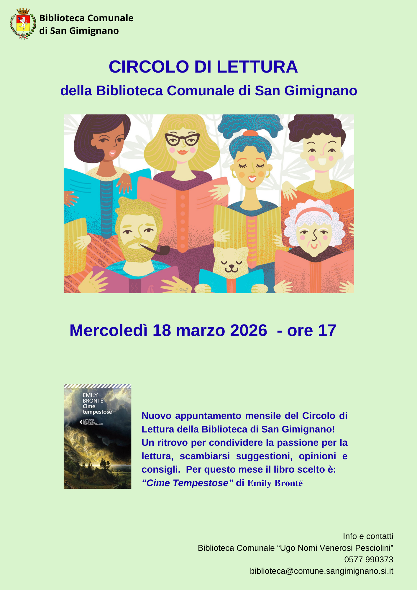 Nuovo appuntamento con il Circolo di lettura alla Biblioteca comunale di San Gimignano, lo spazio dedicato agli appassionati di libri e a chi desidera condividere idee, impressioni e suggerimenti di lettura. L’incontro è in programma mercoledì 18 marzo alle ore 17 presso la Biblioteca comunale, in via Folgore 17.