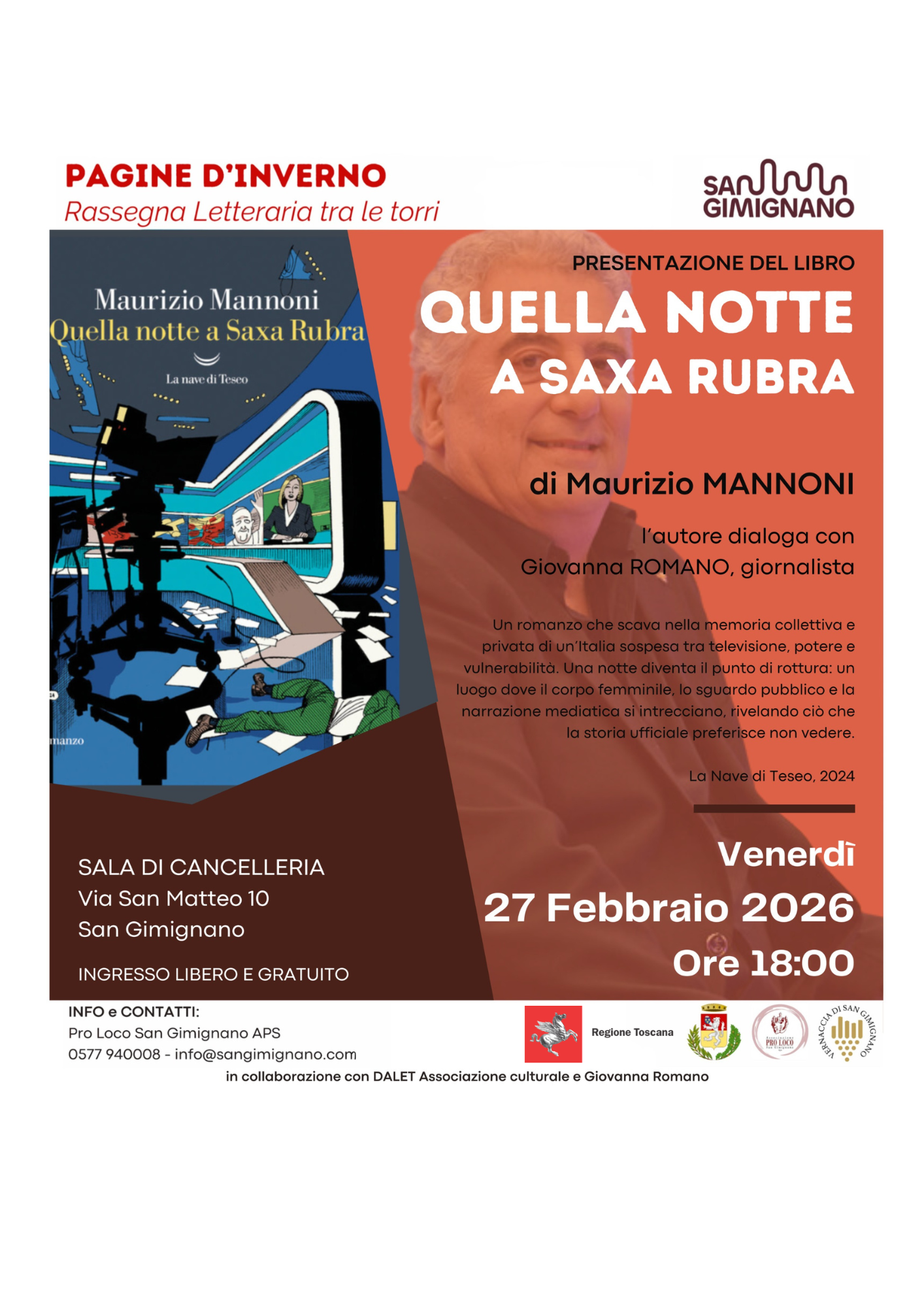 Nuovo appuntamento con la rassegna letteraria ‘Pagine d’Inverno’ a San Gimignano, che venerdì 27 febbraio vedrà protagonista il giornalista Maurizio Mannoni con il suo romanzo noir “Quella notte a Saxa Rubra”, edito da La Nave di Teseo 2024. La presentazione del libro è in programma alle ore 18 nella Sala Cancelleria, in via San Matteo 10, e vedrà la presenza dell’autore che dialogherà con la giornalista Giovanna Romano.