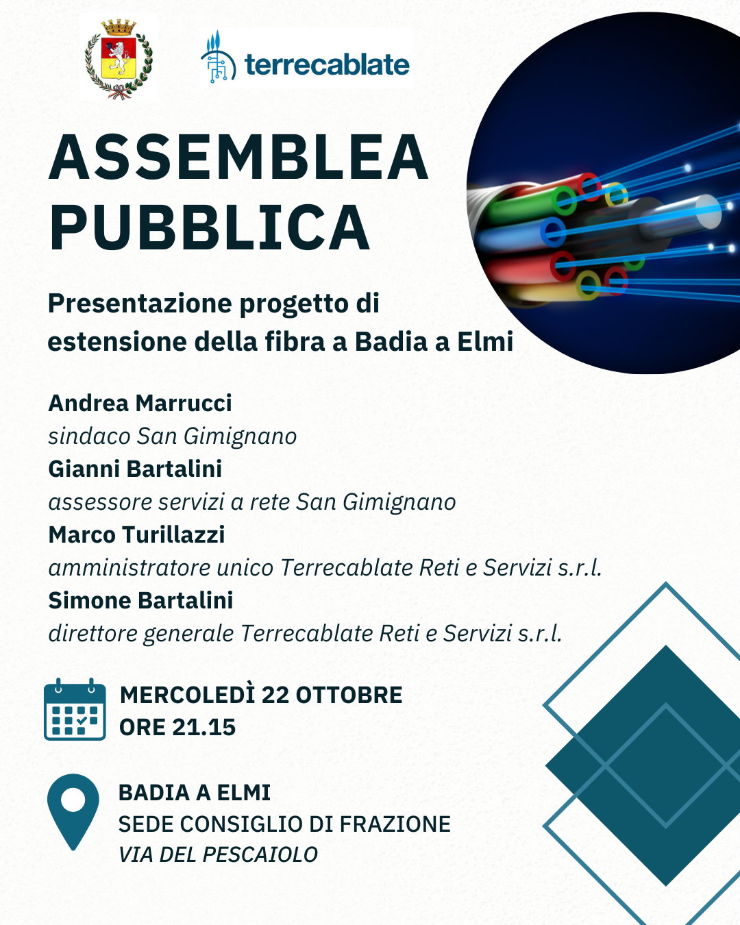 Mercoledì 22 ottobre, alle ore 21.15, sarà presentato il progetto di estensione della fibra ottica nella frazione di Badia a Elmi con un intervento che conta sulla collaborazione fra amministrazione comunale e Terrecablate Reti e Servizi.