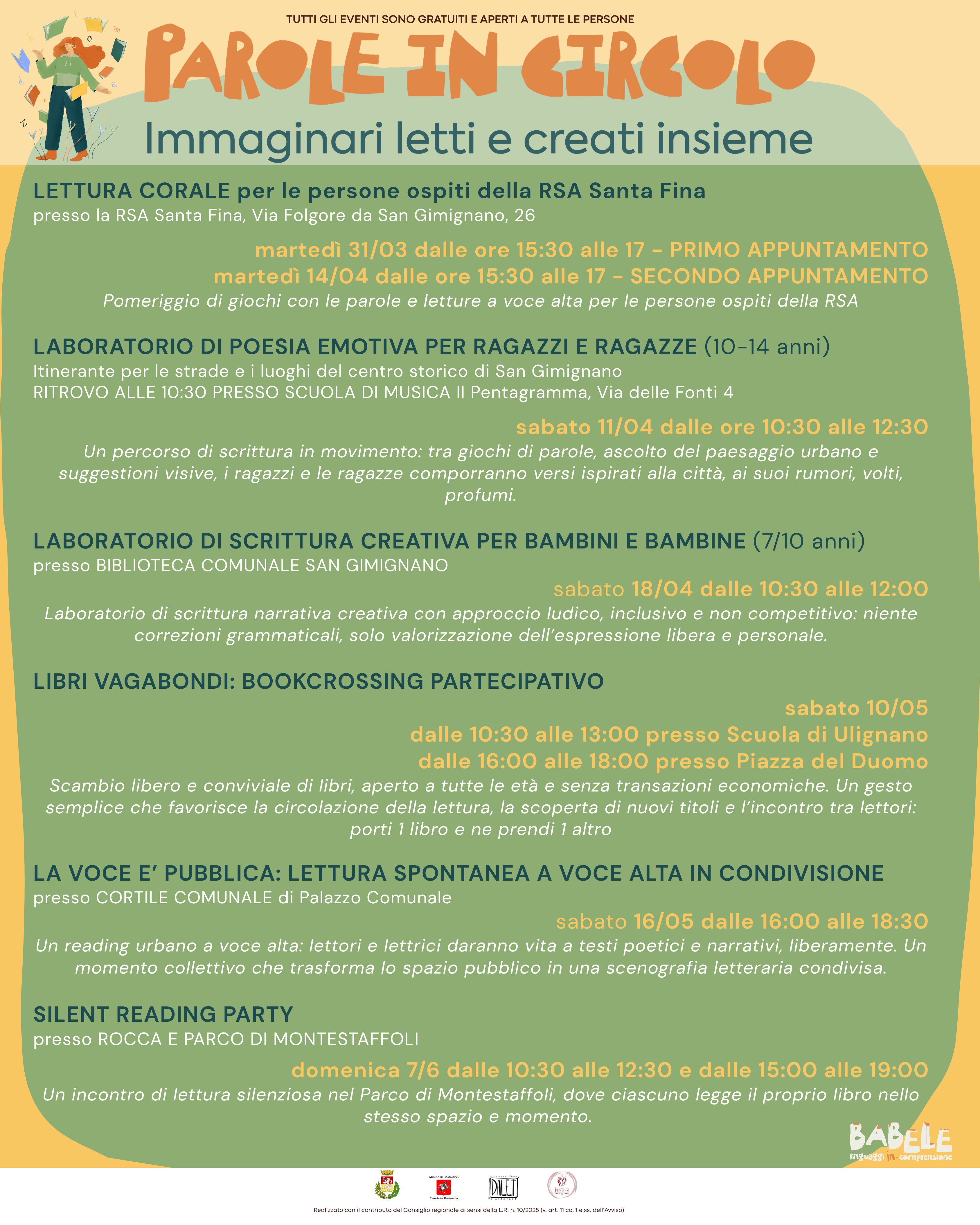 San Gimignano si conferma attenta alla cultura, alla lettura e all’inclusione sociale con “Babele – Linguaggi in comprensione”, un progetto diffuso iniziato nei giorni scorsi e pronto a coinvolgere età e target diversi fino al mese di luglio. L’iniziativa, ideata e organizzata dal Comune e realizzata da Dalet Associazione Culturale, conta su un finanziamento ricevuto attraverso un bando della Regione Toscana per riportare la lettura al centro della vita comunitaria, promuovere il dialogo interculturale e favorire la partecipazione attiva dei cittadini.