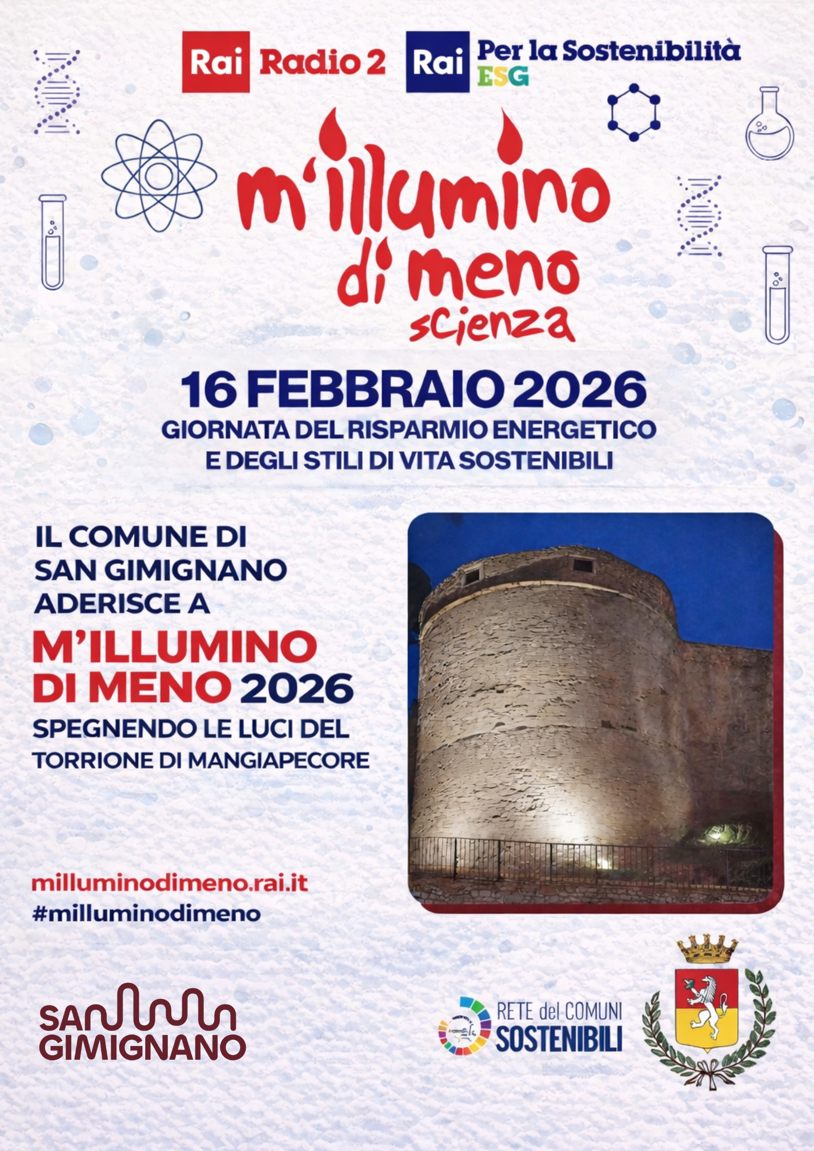 Luci spente lunedì 16 febbraio al Torrione di Mangiapecore di San Gimignano per aderire a “M’illumino di meno" 2026, la Giornata nazionale del risparmio energetico e degli stili di vita sostenibili giunta alla 22° edizione e nata dalla trasmissione radiofonica Rai Radio2 con il programma Caterpillar dopo la firma del Protocollo di Kyoto. Lo spegnimento simbolico è previsto in orario notturno.