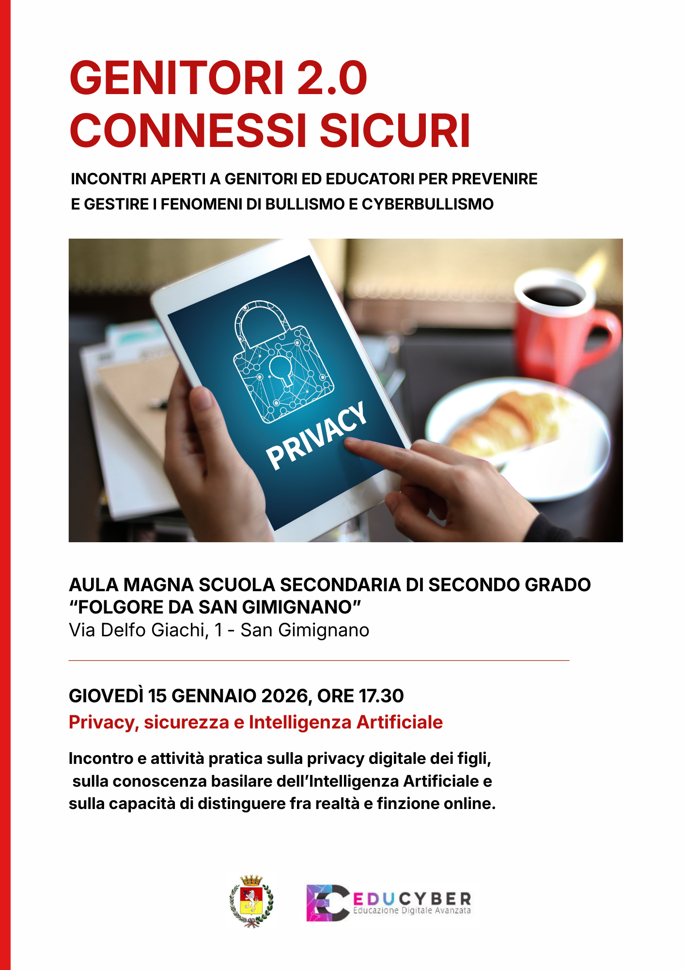 L’incontro di giovedì 15 gennaio sarà dedicato al tema “Privacy, sicurezza e Intelligenza Artificiale” e coinvolgerà genitori e comunità educante in un approfondimento su alcuni degli aspetti più delicati della vita digitale di bambini e adolescenti. L’appuntamento sarà dedicato alla tutela della privacy dei minori, ai rischi legati alla manipolazione dei contenuti online e ai meccanismi basilari dell’Intelligenza Artificiale per rafforzare la capacità critica delle famiglie e aiutare i ragazzi a distinguere fra realtà e finzione nello spazio digitale.